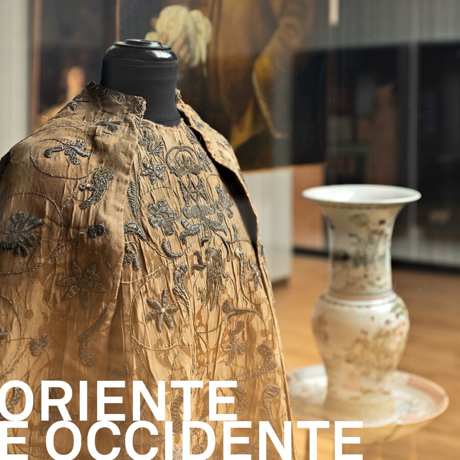 Il dialogo tra Oriente e Occidente è protagonista anche dell’ultima vetrina in cui è messo in scena un confronto tra due culture figurative, quella occidentale, rappresentata da un abito con mantello in damasco ricamato in oro con alle spalle un bellissimo ritratto di gentiluomo attribuito ad Agostino Carracci, e quella orientale, simboleggiata da un vaso cinese del XVII secolo.